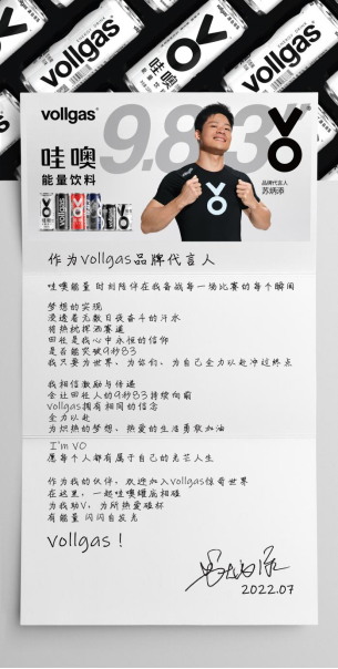 vollgas品牌和饮料浓浆源自德国,对苏炳添这样的运动员来说,能够在训练和备战中喝到健康安全,并提供充足能量补给的饮料,有助于进入良好的状态。哇噢能量饮料产品经国家权威检测机构检测248项指标均不含违规物质,产品中富含维生素B族,含有牛磺酸及纯植物提取的咖啡因,足以看出品牌对产品品质的重视。更重要的是,vollgas提倡的全力以赴的品牌精神与苏炳添如此契合,为热爱拼尽全力,是vollgas和苏炳添共同的生活理念。