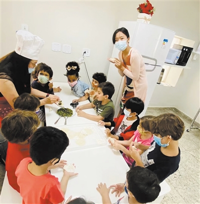 巴西里约热内卢市里约中文学校的学生们在学习包饺子。