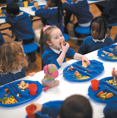 当地时间2022年11月26日,英国伦敦圣玛丽RC小学的学生们在吃午餐。