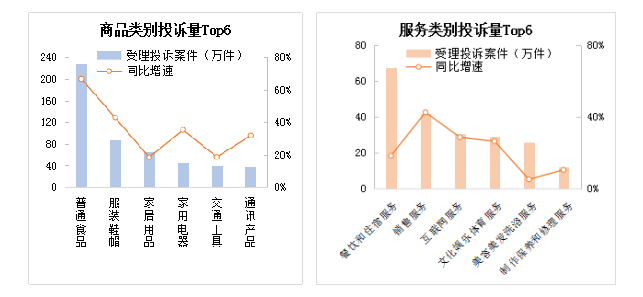 2022年,全国市场监管部门共受理商品投诉862.32万件,占投诉的65.81%,较上年提高4.37个百分点;服务投诉448.06万件,占投诉的34.19%。商品类投诉占比提升,反映了实体经济下行压力下产品质量问题凸显,其中投诉量靠前的是:普通食品、服装鞋帽、家居用品、家用电器、交通工具、通讯产品,占比58.43%。服务投诉量靠前的是:餐饮住宿、销售、互联网服务、文化娱乐体育、美容美发洗浴,占比46.37%。