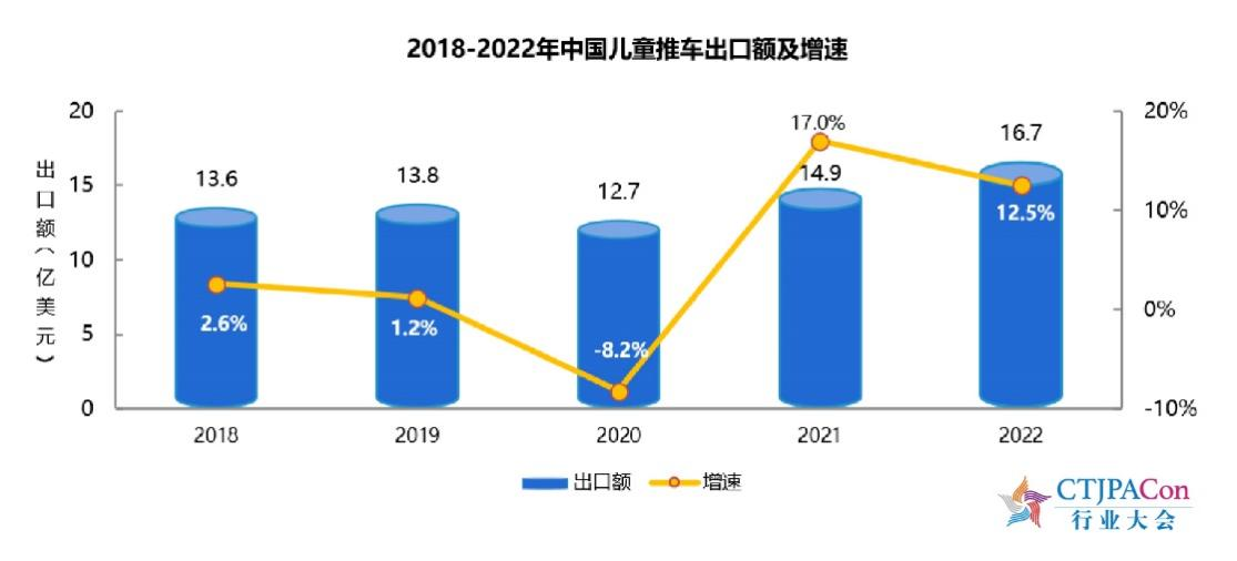 2022年中国玩具(不含游戏)出口额为483.6亿美元,比上年增长5.6%;对RCEP成员国出口额为118.1亿美元,比上年增长36.1%。2022年,中国儿童推车出口额为16.7亿美元,比上年增长12.5%;第一出口目的地为美国,出口额比上年增长12.0%;对RCEP成员国出口额为2.7亿美元,比上年增长37.2 %。