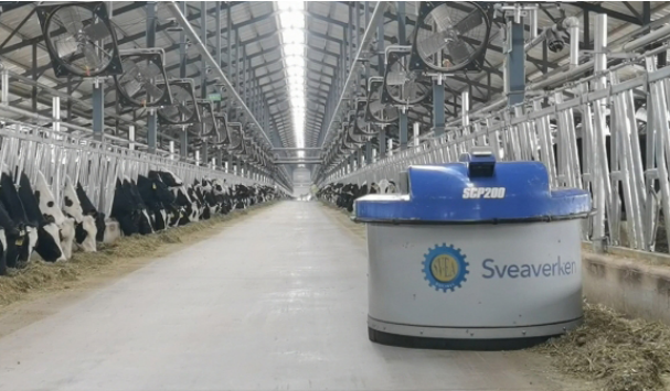 推料机器人在奶牛采食过程中,通过提前设定好的推料的工作时间和路线,机器人自动进行饲料的推送,让奶牛更轻松进行采食。牧场还能通过监控设备及物联网系统实时监控奶牛采食量,智能调整饲料投放量和饲料配比。通过智能饲喂系统彻底释放了人员的投入,真正做到了无人化、定时化、精准化。