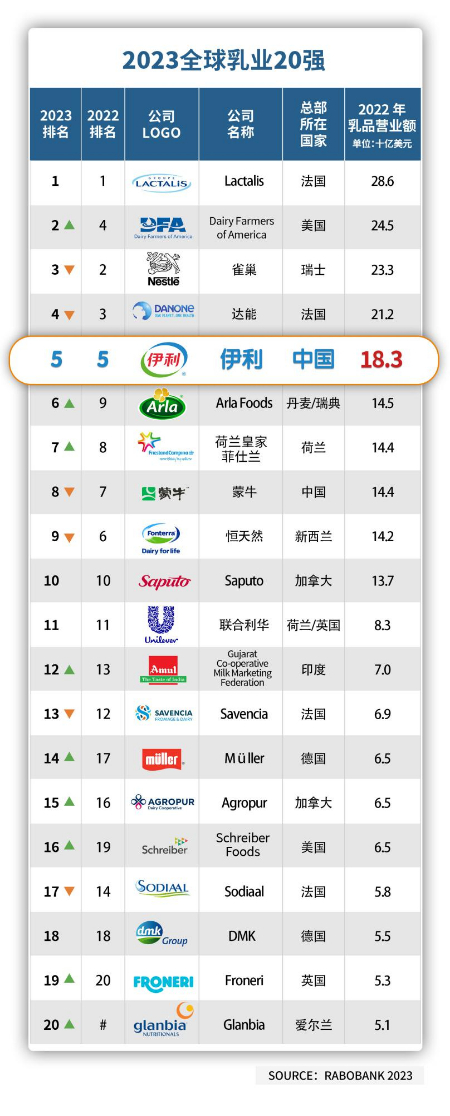 8月29日,荷兰合作银行发布“2023年全球乳业20强”榜单,伊利稳居全球乳业五强,连续十年蝉联亚洲乳业第一,再次成为唯一进入全球五强的中国乳企。这是伊利继8月22日夺得Brand Finance“全球最具价值乳品品牌榜”四连冠后,再度获得国际权威评估机构的认可,持续向世界传递中国乳企的硬核实力。