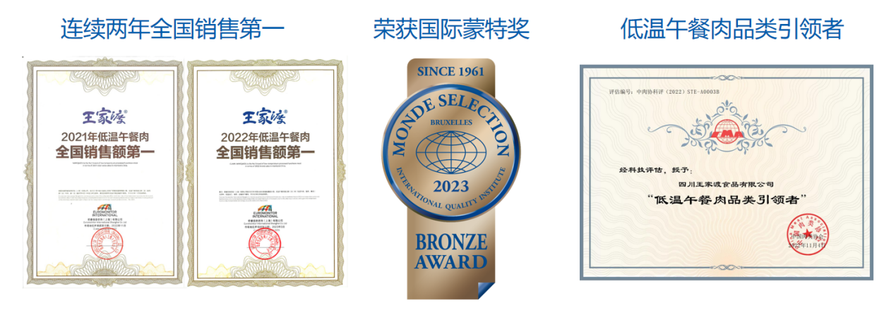 据了解,王家渡低温午餐肉与中国标准化研究院联合研发并获批发布低温午餐肉产品系列标准。2021年、2022年连续获得低温午餐肉全国销售额领先,并荣获2023年国际蒙特奖。