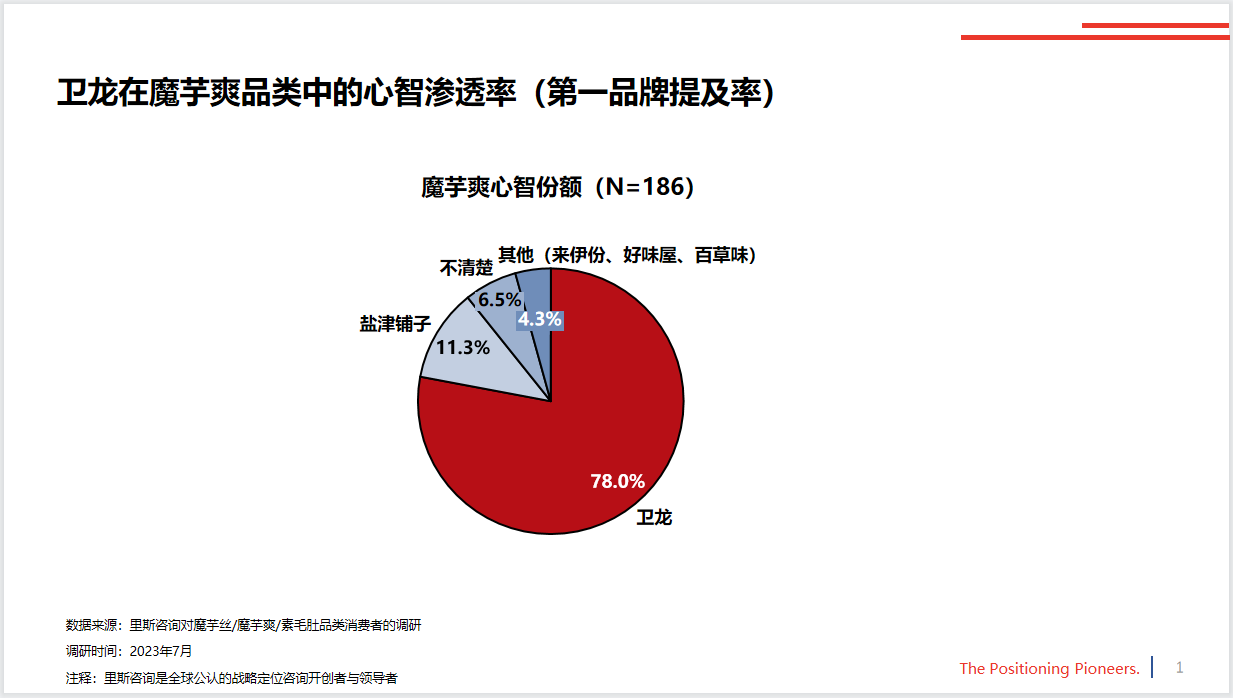 根据里斯咨询的调研显示,卫龙凭借魔芋爽在同品类中的心智渗透率已达78%,远超其他品牌。就在日前,卫龙魔芋爽在淘宝平台上取得了“淘宝100W+”的销售成绩,拿下淘宝首届“金桃子奖”,足以彰显其在市场上的强大影响力。