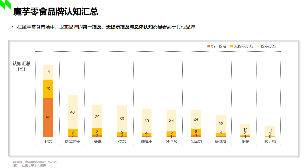 据2022年尼尔森调研显示,在魔芋市场中,卫龙品牌的第一提及、无提示提及与总体认知都显著高于其他品牌。显然,卫龙发明的魔芋爽在市场中已然奠定了良好且坚固的受众认知基础,那么“小魔女”的加入,不仅进一步充实了卫龙自身的产品矩阵,占位了“魔芋素毛肚”的产品类目,也将引领魔芋休闲食品赛道迈向更高品质的发展方向,为市场创造全新的增量机遇。