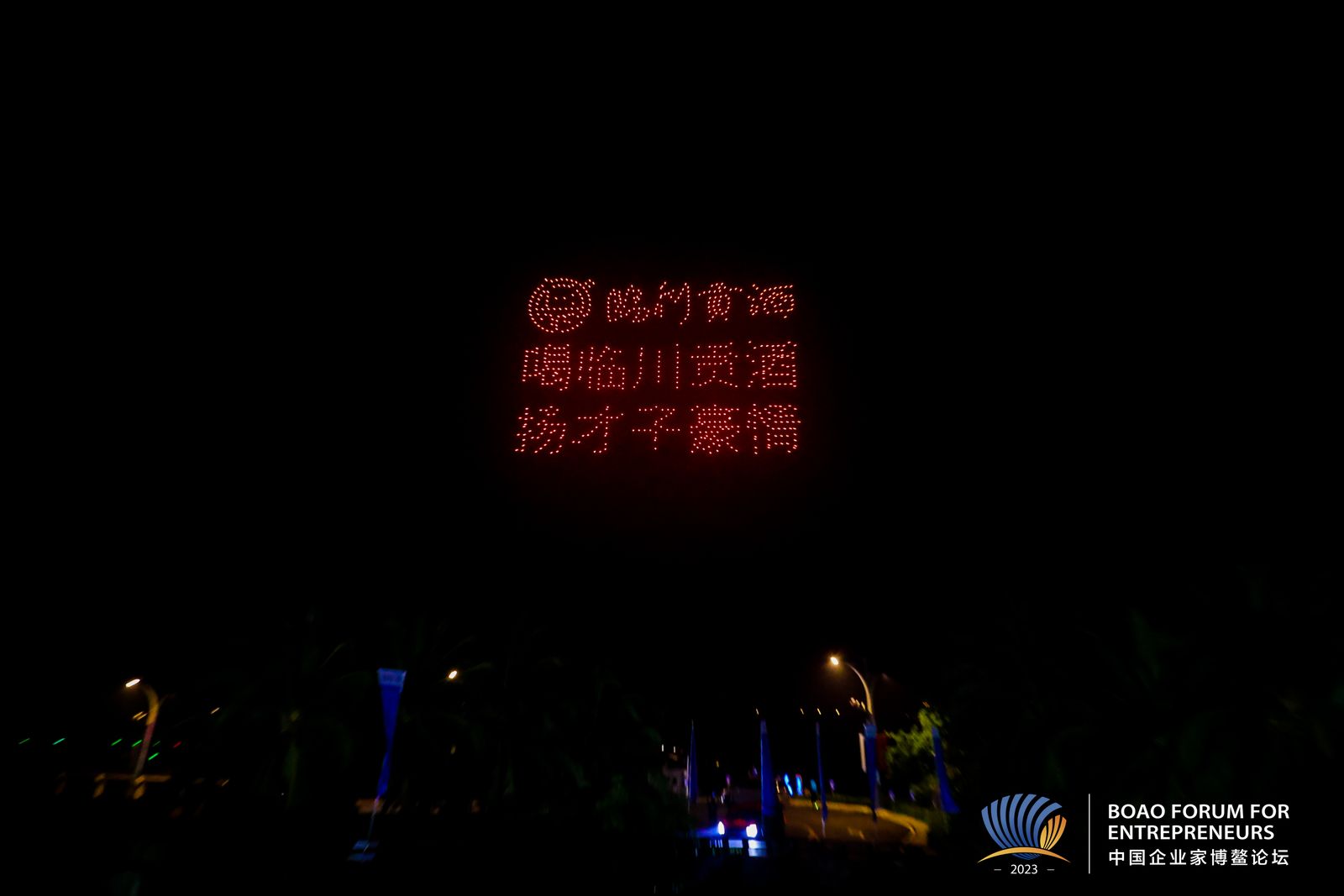 临川贡酒亮相2023中国企业家博鳌论坛无人机空中秀。