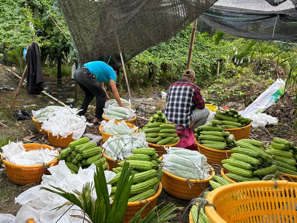 摘瓜、装筐、取袋、装车……下午五点,海南省三亚市育才生态区那受村村民苏江宏和家人正在田地里忙碌,经过他的仔细挑选,一根根泛着青绿光泽的苦瓜被整齐地摆放在运输车里。第二天一早,他将带着这一车“鲜绿”前往三亚崖州果蔬综合批发市场售卖,销往省外市场。