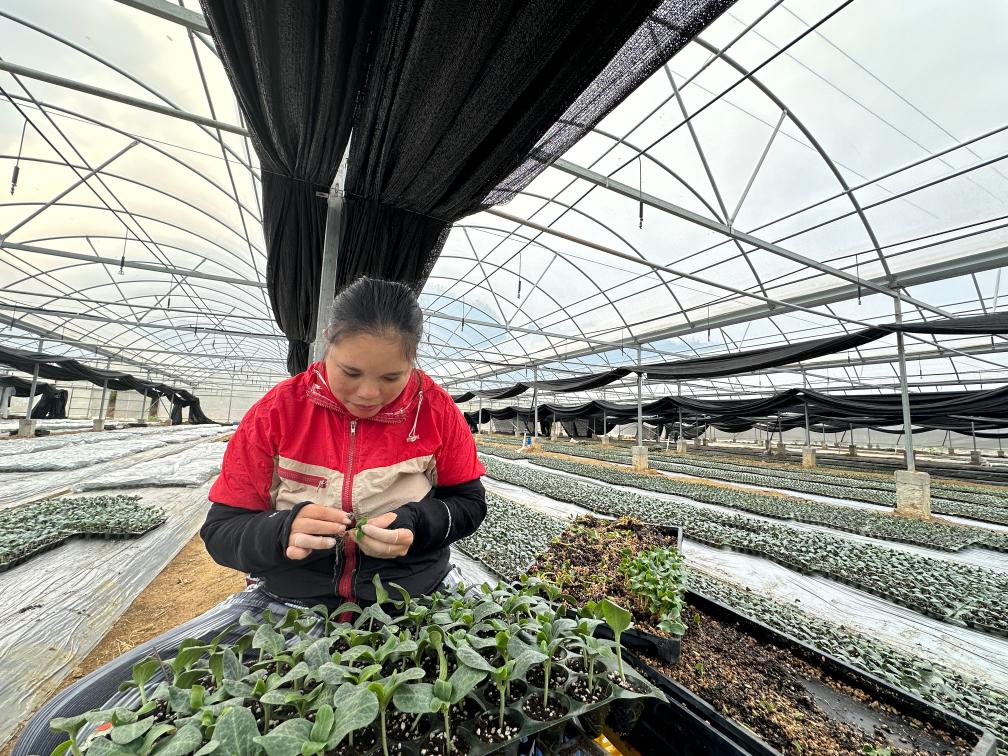 12月25日,村民在那受村集体蔬菜瓜果大棚基地里嫁接瓜苗。新华社记者袁睿 摄