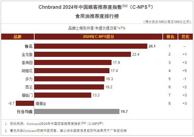2024年1月24日,中国知名品牌评估机构Chnbrand发布了2024年(第十届)中国顾客推荐度指数SM(C-NPS®)品牌排名与分析报告。鲁花在食用油领域已连续七年稳坐冠军宝座,同时在调味品领域也荣获推荐度第一的佳绩。这份荣誉背后,是消费者对鲁花产品品质的高度认可。