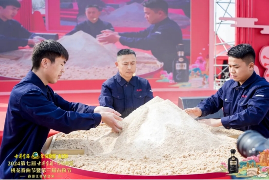 在桃花春曲节现场,古井贡酒的酿酒师傅们演绎了传承千年的非遗酿造技艺。师傅们挥锨上甑,静待原酒汩汩而来。游客们驻足观看,被师傅们的酿酒技艺吸引,被古井贡酒原酒酒香挽留,身临其境地体验了酿造之美,感受国家级非物质文化遗产的魅力,并纷纷点赞。