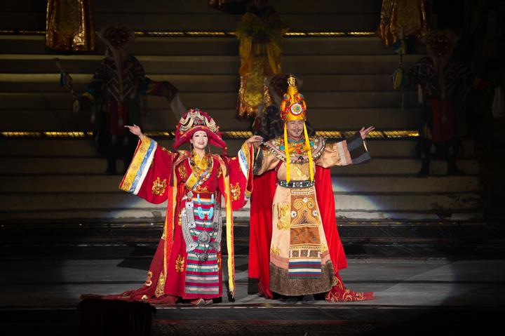 宝瓶山前,被誉为“藏文化活化石”的藏戏,将久远的故事娓娓道来;在刚健豪放的鼓点中,演员们跳起藏族传统舞蹈——卓舞;“行驶”在“风浪”之中的牛皮船、壮观的打阿嘎等非遗文化,用古老的魅力演绎着历史故事……90分钟的《文成公主》演出,浓缩了大量民族元素与非物质文化遗产,不断将观众情感一次次推向高潮。