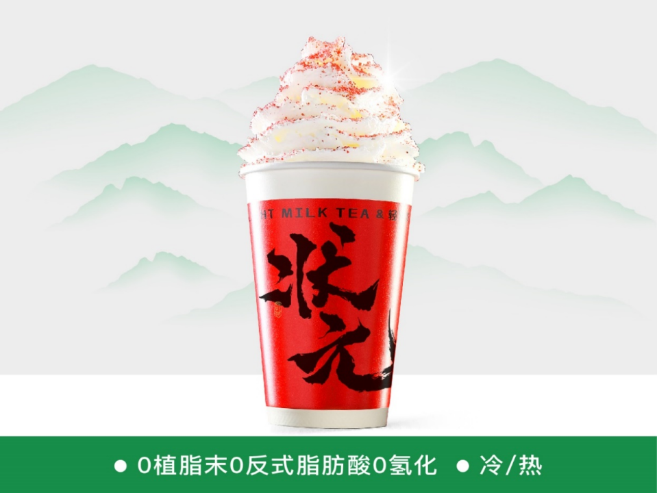 状元红袍轻乳茶,在岩骨花香的大红袍茶底基础上,加入适宜6月的黄酒风味,动物奶油雪顶搭配红丝绒粉末,寓意鸿运当头状元高中;状元”轻乳茶系列,寻味茶香、原叶鲜煮,体现了茶米茶秉承自然、初心和本真,用原香“状元”茶,搭配“三零”真奶,寓意有料真本事,高考学子们考场见真章。