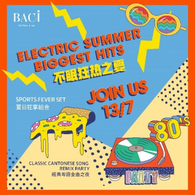 今个夏天7月13日晚上11点至零晨1点, BACI Trattoria & Bar 特邀知名DJ FUNKY亲临现场,为您打造一场绝伦的音乐盛宴。当晚将播放多首经典的粤语金曲,明快的节奏,仿佛时光倒流,带您重温80年代兰桂坊的繁华夜生活。时间7月13日晚上11点至1点。
