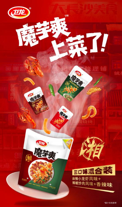 当致力于深度洞察辣味消费市场的卫龙注意到湘菜和“锅气”在年轻消费圈层中的话题度,这个辣味休闲零食国民品牌立刻选择再出奇招,继榴莲辣条后将旗下大单品魔芋爽与湘菜经典菜式结合在一起,推出了麻辣小龙虾风味和辣椒炒肉风味的魔芋爽,让“卫龙不只是一种辣”的品牌主张又一次占领消费者心智。