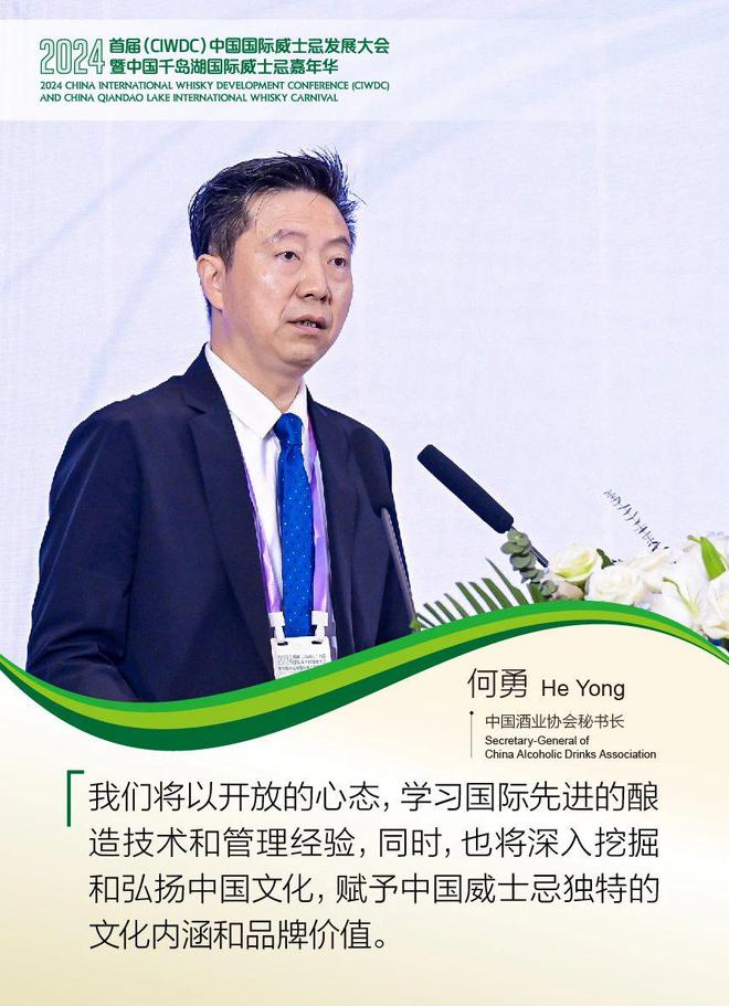 何勇秘书长在开幕式上作了以《世界美酒 中国风味》为主题的发言。他表示,中国威士忌已经走过了上百年的时光,经历了多次起伏,随着标准化体系的建立,中国的威士忌产业已经从上游的生产和下游的市场构建起相对完整的链条,呈现出发展速度快、市场热度高等产业特征,显示出强劲的市场增长潜力。展望未来,何勇秘书长认为,要以消费为引,推动市场;要以天赋为根,酿造精品;要以产区为本,打造经济;要以风味为魂,让中国威士忌成为连接世界与中国的桥梁,共绘世界威士忌蓝图。