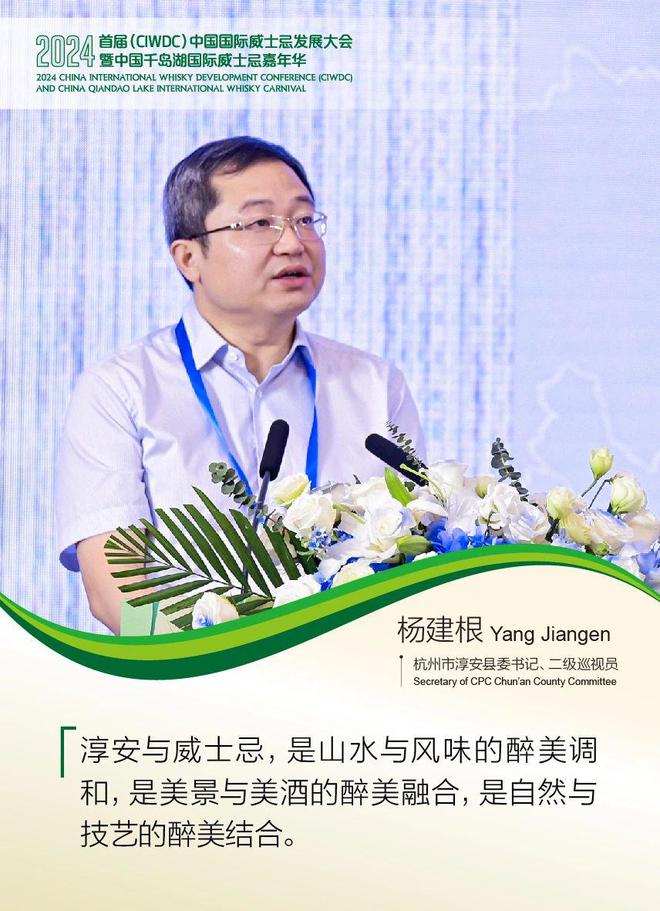 杨建根书记介绍了淳安发展威士忌产业得天独厚的环境优势和资源禀赋。他表示,淳安与威士忌,是山水与风味的醉美调和,是美景与美酒的醉美融合,是自然与技艺的醉美结合。作为地方政府,淳安舍得投入、舍得时间,竭尽全力为威士忌项目提供最优、最好的服务和保障,把最稀缺的资源寄于酒,把最优质的服务用于酒,把最有力的保障倾于酒。淳安将聚焦威士忌赛道,以初心推动环境更优,以真心推动产业更好,以匠心推动形象更佳,擦亮“高品质风味、高端性产品、高定位品牌”的千岛湖威士忌金名片。