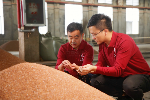 2023年下沙季,张支云酿酒技法传承人张富强、张炀深入生产一线,检查酿酒用高粱的品质。