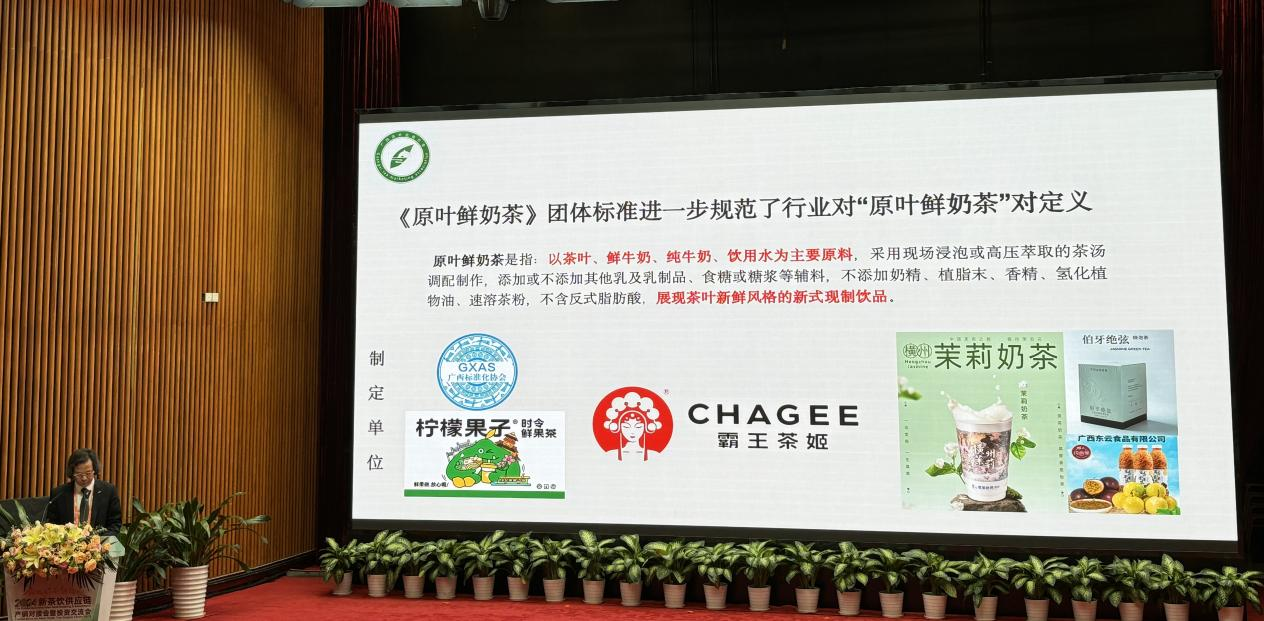 9月26日,由广西茶叶流通协会提出,茶姬(上海)品牌管理有限公司牵头,广西茶叶流通协会、南宁学院食品与质量工程学院、广西茶姬企业管理有限公司、横州市香茹怡茉茶饮有限公司、柳州市太阳人餐饮管理有限公司、横县桔扬茶业有限公司、忆美园(广西)农业科技有限公司、广西东云食品有限公司等单位共同参与起草的原创性高质量团体标准《原叶鲜奶茶》正式在第一届世界奶茶大会上获得广西标准化协会的批准发布实施,这是首个新式茶饮原叶鲜奶茶团体标准。