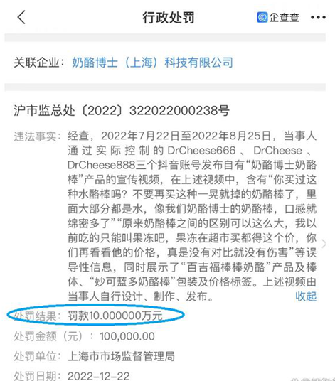 该纠纷可以追溯到2022年。上海市市场监督管理局发布的处罚单显示:经查,2022年7月22日至2022年8月25日,当事人通过实际控制的DrCheese666、DrCheese、DrCheese888三个抖音账号发布自有“奶酪博士奶酪棒”产品的宣传视频,在上述视频中,含有“你买过这种水酪棒吗?不要再买这种一晃就掉的奶酪棒了,里面大部分都是水,像我们奶酪博士的奶酪棒,口感就绵密多了”、“原来奶酪棒之间的区别可以这么大,我以前吃的只能叫果冻吧,果冻在超市买都得这个价,你们再看看他的价格,真是没有对比就没有伤害”等误导性信息,同时展示了“百吉福棒棒奶酪”产品及棒体、“妙可蓝多奶酪棒”包装及价格标签。上述视频由当事人自行设计、制作、发布。