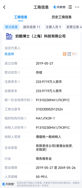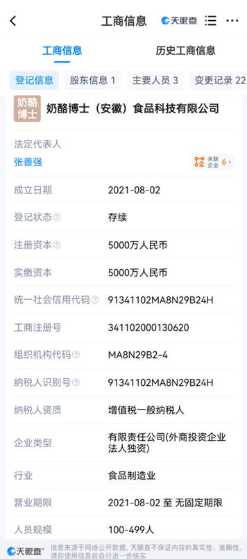 据天眼查信息显示,奶酪博士(上海)科技有限公司成立于2019年5月,是一家从事商业服务业为主的企业。奶酪博士(安徽)食品科技有限公司成立于2021年8月,主要从事食品制造业。(任禹西)