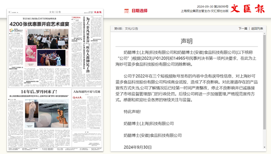 近日,奶酪博士(上海)科技有限公司和奶酪博士(安徽)食品科技有限公司在《文汇报》刊发《声明》承认对上海妙可蓝多食品科技股份有限公司(下称“妙可蓝多”)构成商业诋毁。《声明》全文如下: