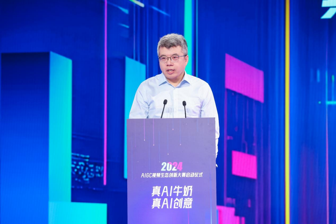 随后,工业和信息化部消费品工业司原司长高延敏,新华网首席营销官徐明伟,伊利集团数字科技中心总经理尚直虎,阿里云智能集团副总裁高飞,中国广告协会副会长、AIGC营销委员会专家组组长、广告人文化集团总裁穆虹共同启动“2024AIGC视频生态创新大赛”。