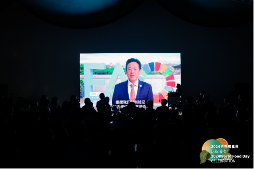 活动现场播放联合国粮农组织总干事屈冬玉2024世界粮食日视频致辞。©粮农组织/七九八文科