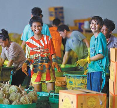 榴莲是中国第一大水果进口品类。据统计,2023年中国进口142.6万吨鲜榴莲,其中92.9万吨来自泰国。中国市场的强劲需求,带动了泰国水果产业发展。泰国商业部数据显示,2024年尖竹汶府的榴莲产量预计突破56万吨,同比增长超4.3%。同时,山竹、龙宫果等热带水果的产量也迎来了快速增长。“我推荐了不少亲朋好友来水果加工厂上班,收入有保障,旺季的提成更是丰厚!”猜维开心地说。