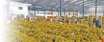 在位于泰国尖竹汶府的优果东明水果厂,经过分拣和清洁处理的榴莲按品级分类整齐堆放、等待装箱。记者 白元琪摄