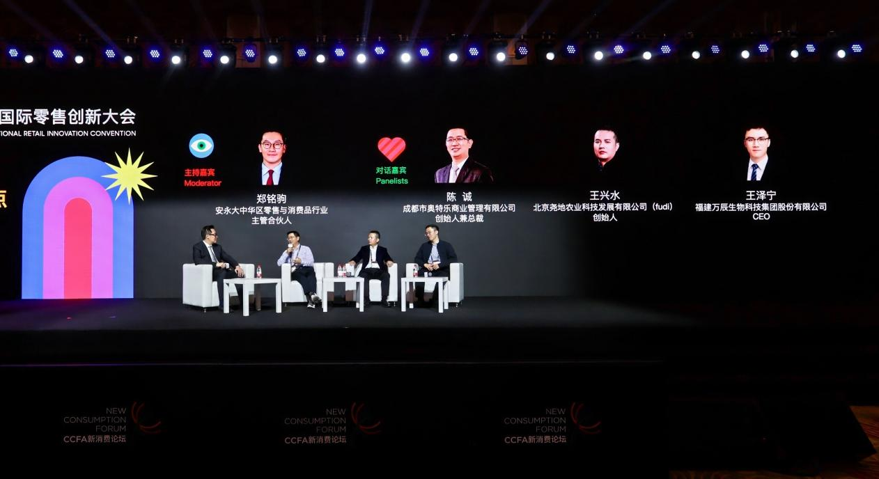 在对话环节,安永大中华区零售与消费品行业主管合伙人郑铭驹作为主持嘉宾,与对话嘉宾成都市奥特乐商业管理有限公司创始人兼总裁陈诚、北京尧地农业科技发展有限公司(fudi)创始人王兴水、福建万辰生物科技集团股份有限公司CEO王泽宁,共同围绕“零售新增长点”这一话题展开深入探讨。