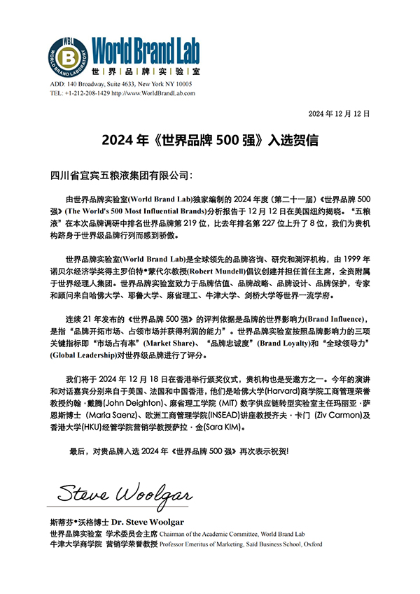 美国当地时间12月12日,世界品牌实验室于美国纽约发布了2024年度《世界品牌500强》榜单。五粮液连续第八年荣登榜单,品牌排名增幅位居白酒行业第一。作为白酒领军企业,五粮液以丰富形式持续提升品牌知名度和美誉度,不断推动中国白酒文化的国际化传播,加深全球消费者对中国传统文化的理解与欣赏,成为中国品牌在国际舞台的一张亮丽名片。