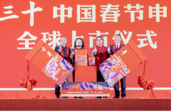 苑利,国家一级作曲家、著名歌唱家孟文豪,梁金辉,闫立军共同发布中国春节申遗成功纪念版古井贡酒·年三十
