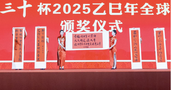 “楹”传千年造诣,“联”结万家灯火。古井贡酒连续三年与中国楹联学会、《中国楹联报》等单位,携手举办“古井贡酒·年三十杯全球春联征集大赛”,让楹联在活态传承中赓续文脉。活动上,中国楹联学会副会长何小平为古井贡酒·年三十 2025全球楹联征集大赛一等奖和二等奖获奖代表颁奖。