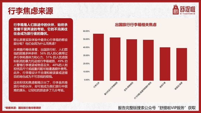 1月9日启动活动现场,舒提啦发布了《2025出国焦虑报告》。“我们发现,顾客在面对出国场景时的不安感会上升,对旅行箱有更多、更高要求,因此舒提啦进行了市场调研,研究出国顾客面临哪些焦虑,并对我们的产品和服务进行针对性改良。”舒提啦创始人张铭庭介绍,公司联合了“新一代企业赋能专家”赢政通、AI技术合作方Bayestone、时尚媒体Fashion Network以及专注高端旅游定制的“六人游”共同进行调研、分析和研讨,此次一共调研了600位有国际旅行经验的旅行者,共收集了300多份有效问卷。
