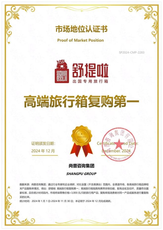舒提啦凭借持续的技术革新与消费者口碑,赢得了行业与市场的双重认可。近期,舒提啦荣获尚普咨询【高端旅行箱复购第一】市场认证,成为行业中当之无愧的领跑者。