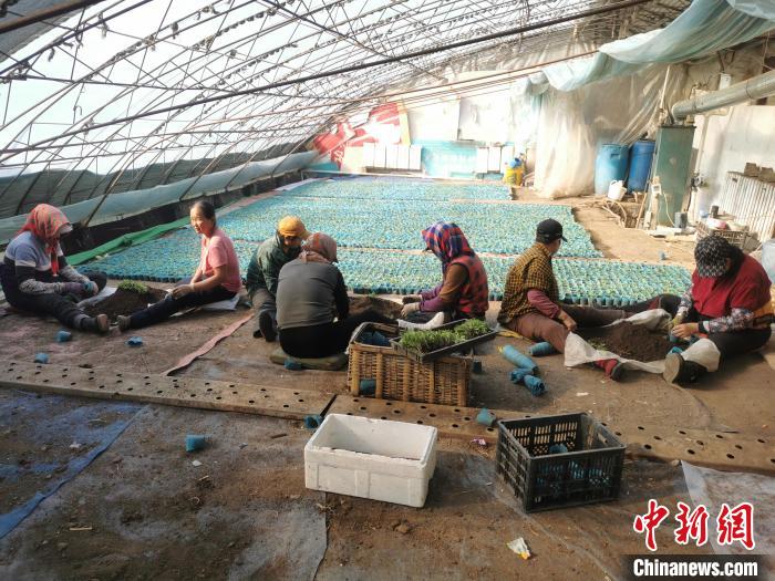 哈尔滨市香坊区幸福镇光明村育苗大棚内,村民正在抓紧育苗。 刘锡菊 摄