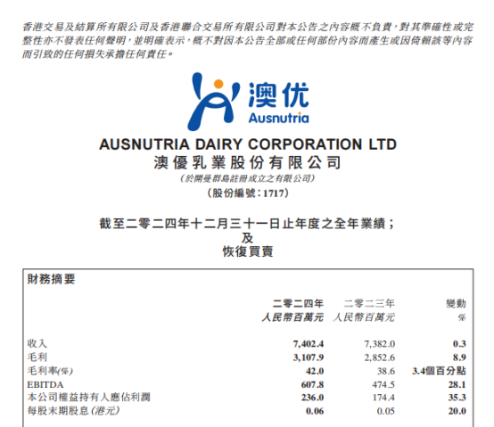 4月10日,澳优乳业股份有限公司(股份代号:1717.HK)发布2024年度业绩公告。公告显示:2024年,澳优实现营业收入约人民币74.02亿元,同比增长0.3%;归属于母公司权益持有人应占利润约人民币2.36亿元,同比增长35.3%,实现营收利润韧性双增长。值得一提的是,澳优国际业务驶入快车道,同比大幅增长68.2%,成为驱动业绩增长的新引擎。