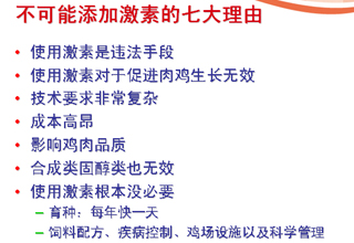 专家指出,“肉鸡之所以能够快速的成长,主要是通过不断引进具有最新遗传育种进展的肉用种鸡;科学地投放营养全面高效的饲料,保障肉鸡的健康;不断改善提高肉鸡的养殖环境,保障了肉鸡生产效率的发挥。”因此,使用激素这种昂贵的生物产品刺激生长的方法就变得没有任何价值和意义。 [详细]