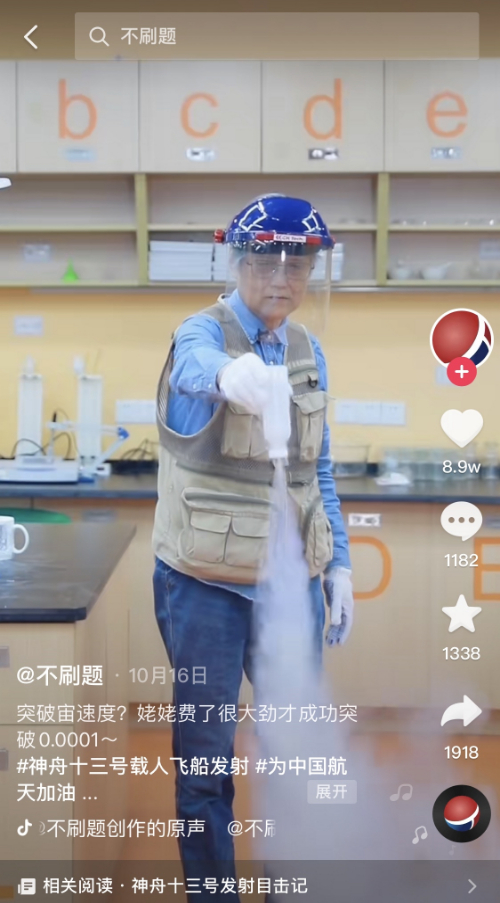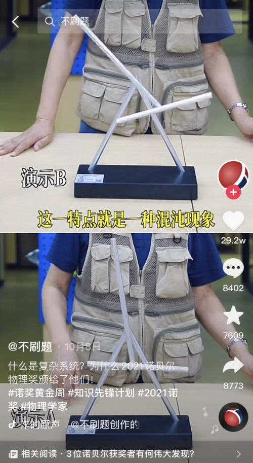 截至目前,“不刷题”账号已经积累了122万粉丝,获得点赞368万。“科学姥姥”之外,越来越多的自然科普内容开始走红短视频平台。公开数据显示,过去一年,仅抖音平台上,自然科普类视频累计播放近330亿次,7亿人次为相关作品点赞。在网友们最关注的自然科普内容品类中,物理居于前五。曾经让无数人头疼、害怕的学科,正成为越来越多人愿意看、喜欢看的内容。