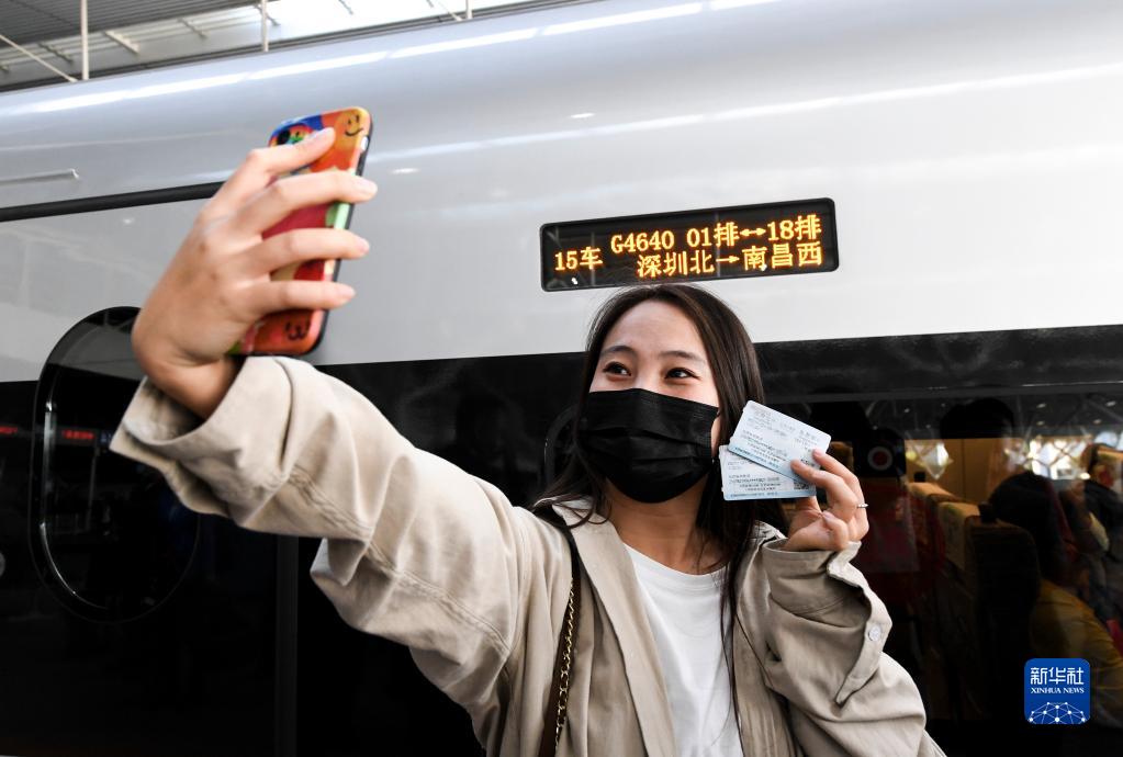 12月10日,乘客准备搭乘赣深高铁深圳北站开往南昌西站的首班列车时,在车厢外自拍留影。新华社记者 毛思倩 摄