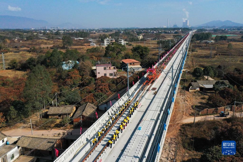 2月1日,中铁四局建设者在赣深高铁汕湛高速特大桥无砟轨道上准备铺设首条铁轨(无人机照片)。新华社记者 刘大伟 摄
