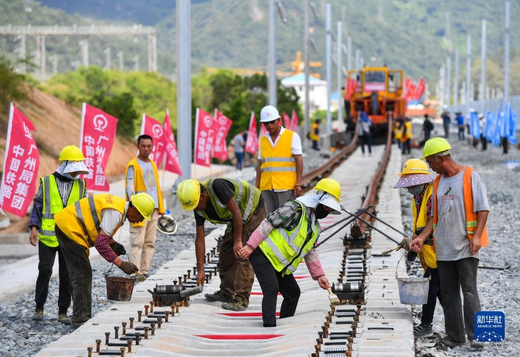 5月27日,中铁四局施工人员在深圳北站外铺设赣深铁路广东段南端大里程方向最后一对长轨。新华社记者 刘大伟 摄