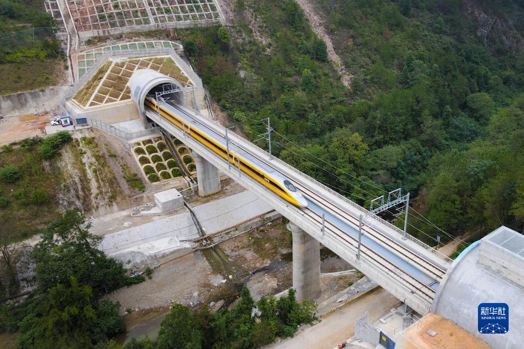 10月14日,列车经过龙南隧道(无人机照片)。新华社发(张海根 摄)