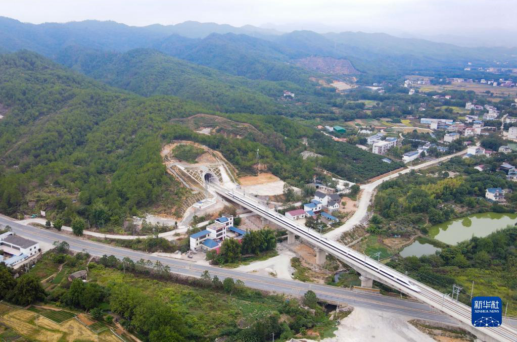 10月14日,联调联试列车驶入定南南站(无人机照片)。新华社发(张海根 摄)