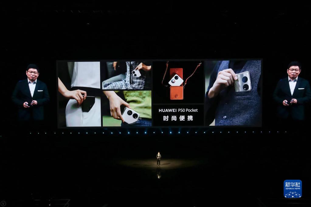 12月23日,华为常务董事、消费者业务CEO余承东在深圳举行的发布会上介绍HUAWEI P50 Pocket旗舰折叠屏手机。新华社发(华为供图)