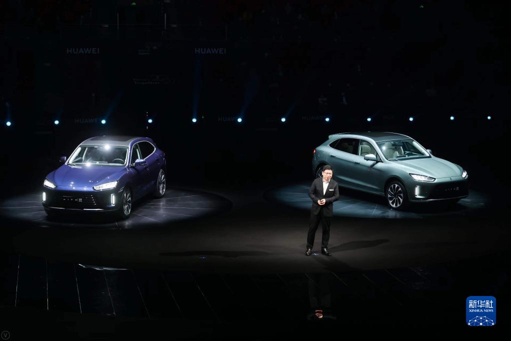 12月23日,华为常务董事、消费者业务CEO余承东在深圳举行的发布会上介绍AITO问界M5智能汽车。新华社发(华为供图)