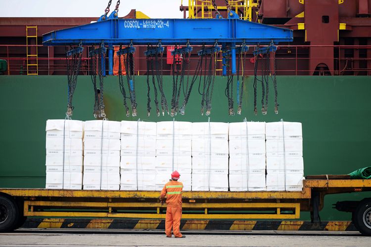 2020年我国进口木浆消耗量约占总消耗量的七成。图为山东青岛港杂货码头,货轮在卸载进口纸浆。图片来源:视觉中国 新华网发