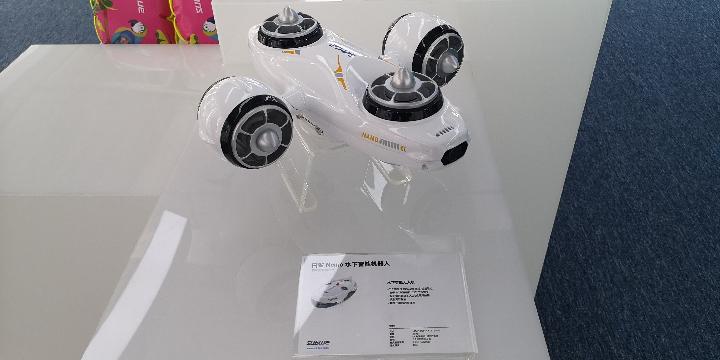走进“深之蓝”展厅,一款比游戏机手柄略大的设备引起记者的注意。这是一款迷你水下机器人。机器人可以在设定识别目标的情况下,全程跟着人或鱼群移动,并自主选取角度拍照。