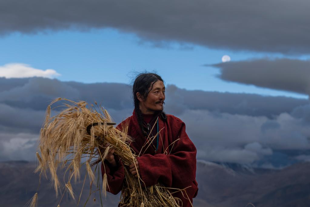 2021年9月23日清晨,西藏那曲市尼玛县文部乡文部南村村民开镰收割。新华社记者孙瑞博 摄